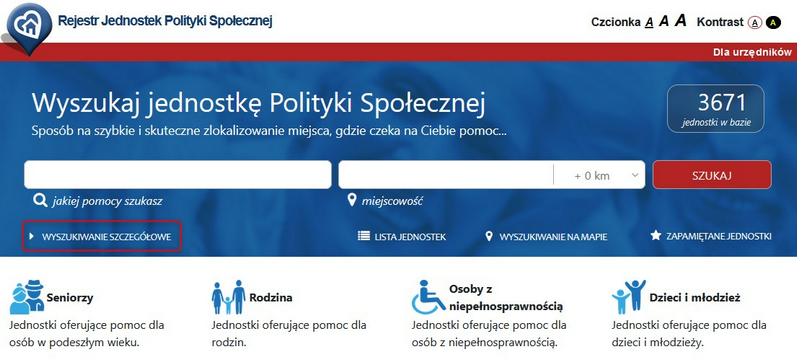 Strona główna Rejestru Jednostek Polityki Społecznej, obsługiwana przez niezalogowanych użytkowników została dostosowana do celów związanych z główną funkcją działania portalu - wyszukiwaniem Jednostek w zakresie oferowanej formy pomocy.